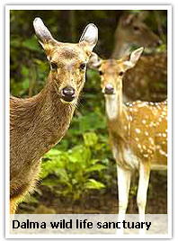 Dalma Wildlife Sanctuary : Dalma Mountain Range is at an altitude of 3000 feet. Lurking in the thick cover of its jungle (193 sq. km.) are elephants, barking deer, sloth beer, porcupines, leopard, tigers etc. The steep slopes of Dalma are a trekker's delight. Small hideouts have been made at several places in the sanctuary where one can see wilds animals in their natural habitat. A look from the mountaintop at the city is so visually appealing at the night that it looks as if millions stars twinkling. Dalma provides natural air condition to the fuming steel city and is an important source of fresh oxygen to the citizens. Late Sanjay Gandhi inaugurated the sanctuary in 1975. On the mountaintop are the guesthouse of Tata Steel and Forest Department. There is also a temple of Hindu diety Shiva on the mountaintop and the devotees throng to it during "Shivaratri".